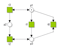 A Petri net, also known as a place/transition net (PT net), is one of several mathematical modeling languages for the description of distributed systems. It is a class of discrete event dynamic system. A Petri net is a directed bipartite graph that has two types of elements: places and transitions. Place elements are depicted as white circles and transition elements are depicted as rectangles. A place can contain any number of tokens, depicted as black circles. A transition is enabled if all places connected to it as inputs contain at least one token. Some sources[1] state that Petri nets were invented in August 1939 by Carl Adam Petri—at the age of 13—for the purpose of describing chemical processes.
