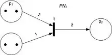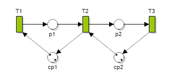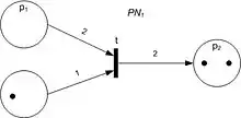 Some definitions of Petri nets explicitly allow this as a syntactic feature.[13] Formally, Petri nets with place capacities can be defined as tuples , where is a Petri net, an assignment of capacities to (some or all) places, and the transition relation is the usual one restricted to the markings in which each place with a capacity has at most that many tokens.
