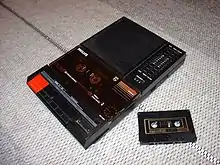 Philips introduced the first combination portable radio and cassette recorder, which was marketed as the "radio recorder", and is now better known as the boom box. Later, the cassette was used in telephone answering machines, including a special form of cassette where the tape was wound on an endless loop. The C-cassette was used as the first mass storage device for early personal computers in the 1970s and 1980s. Philips reduced the cassette size for professional needs with the Mini-Cassette, although it would not be as successful as the Olympus Microcassette. This became the predominant dictation medium up to the advent of fully digital dictation machines. Philips continued with computers through the early 1990s (see separate article: Philips Computers).