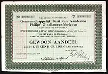 The company was founded in 1891 by Gerard Philips and his father Frederik, with their first products being light bulbs. It currently employs around 80,000 people across 100 countries.[2] The company gained its royal honorary title (hence the Koninklijke) in 1998 and dropped the "Electronics" in its name in 2013,[3] due to its refocusing from consumer electronics to healthcare technology.