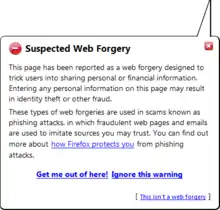Another popular approach to fighting phishing is to maintain a list of known phishing sites and to check websites against the list. One such service is the Safe Browsing service.[115] Web browsers such as Google Chrome, Internet Explorer 7, Mozilla Firefox 2.0, Safari 3.2, and Opera all contain this type of anti-phishing measure.[116][117][118][119][120] Firefox 2 used Google anti-phishing software. Opera 9.1 uses live blacklists from Phishtank, cyscon and GeoTrust, as well as live whitelists from GeoTrust. Some implementations of this approach send the visited URLs to a central service to be checked, which has raised concerns about privacy.[121] According to a report by Mozilla in late 2006, Firefox 2 was found to be more effective than Internet Explorer 7 at detecting fraudulent sites in a study by an independent software testing company.[122]