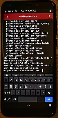 The PinePhone relies completely on open-source operating systems developed by external communities, with only the flashing onto the phone done by Pine64 directly.[29] Because these community OS projects were involved in the development of the PinePhone, it has been ported to 19 Linux distributions and seven graphical user interfaces, as of August 2021,[30] such as Ubuntu Touch by UBports, postmarketOS, Mobian (Debian ARM), LuneOS, Nemo Mobile and Maemo Leste.