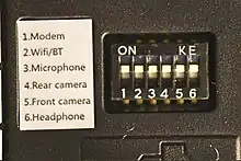 The PinePhone has six DIP switches under the back cover, the first five of which switch off separately the cellular modem, the Wi-Fi/Bluetooth module, the microphone, the rear camera, and the front camera. The sixth DIP switch will convert the 3.5 mm headphone jack into a UART serial port,[20] which is the first time this kind of switch has been included in a mobile phone.