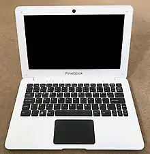 The Pinebook is a low-cost notebook developed by Hong Kong-based computer manufacturer Pine64. The Pinebook was announced in November 2016 and production started in April 2017. It is based on the platform of Pine64's existing Pine A64 single board computer,[1] costing US$89 or US$99 for the 11.6" and 14" model respectively.[2] Its appearance resembles the MacBook Air.[3] The Pinebook is sold "at-cost" by Pine64 as a community service.[4]