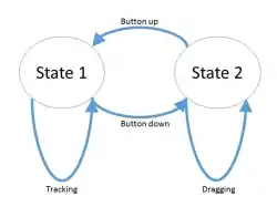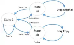| A mouse is moved without the button being pushed. This state can be called tracking, meaning the user just moves the mouse without further interacting with the system. If the mouse is pointed at an icon and the button is pressed while moving the mouse, a new state called dragging is entered. These states are shown in the image "2 State Transaction". |