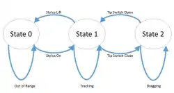 This model describes different states that a pointing device can assume. The three common states as described by Buxton are out of range, tracking and dragging. Not every pointing device can switch to all states.[3]