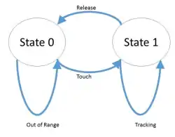 | If a touch tablet, which is able to sense touch or no-touch, is used instead of a mouse, the state model looks different. More precisely this means that any movement of the finger off the display is out of range and has no effect on the system. Only when the finger touches the display, the state switches to tracking (Figure: "Out of Range & Tracking"). |