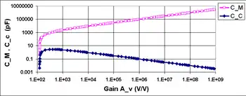 which provides a quadratic equation to determine an appropriate value for CC. Figure 4 shows an example using this equation. At low values of gain this example amplifier satisfies the pole-ratio condition without compensation (that is, in Figure 4 the compensation capacitor CC is small at low gain), but as gain increases, a compensation capacitance rapidly becomes necessary (that is, in Figure 4 the compensation capacitor CC increases rapidly with gain) because the necessary pole ratio increases with gain. For still larger gain, the necessary CC drops with increasing gain because the Miller amplification of CC, which increases with gain (see the Miller equation ), allows a smaller value for CC.