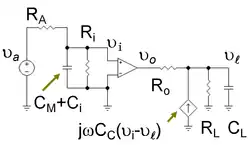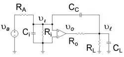 - ↑ The expression for differs a little from ( CM+Ci ) ( RA || Ri ) as found initially for f1, but the difference is minor assuming the load capacitance is not so large that it controls the low frequency response instead of the Miller capacitance.