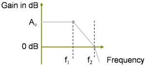 The way to position f2 to obtain the design is shown in Figure 3. At the lowest pole f1, the Bode gain plot breaks slope to fall at 20 dB/decade. The aim is to maintain the 20 dB/decade slope all the way down to zero dB, and taking the ratio of the desired drop in gain (in dB) of 20 log10 Av to the required change in frequency (on a log frequency scale[13]) of ( log10 f2 − log10 f1 ) = log10 ( f2 / f1 ) the slope of the segment between f1 and f2 is: