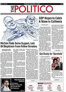 Politico (stylized in all caps), known originally as The Politico, is a Washington metropolitan area, U.S.-based politics-focused digital newspaper company. Founded by American banker and media executive Robert Allbritton in 2007,[4] it covers politics and policy in the United States and internationally, with publications dedicated to politics in the U.S., European Union, United Kingdom and Canada, among others. Primarily providing distributed news, analysis and opinion online, it also produces printed newspapers, radio, and podcasts. Its coverage focuses on topics such as the federal government, lobbying and the media.[5]