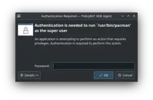 It is also possible to use polkit to execute commands with elevated privileges using the command pkexec followed by the command intended to be executed (with root permission).[9] However, it may be preferable to use sudo, as this command provides more flexibility and security, in addition to being easier to configure.[10]