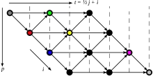 src, after loop skewing. The array elements will be processed in the order gray, red, green, blue, yellow...Performing the affine transformation on the original dependency diagram gives us a new diagram, which is shown in the next image. We can then rewrite the code to loop on p and t instead of i and j, obtaining the following "skewed" routine.