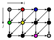 src, before loop skewing. The red dot corresponds to src[1][0]; the pink dot corresponds to src[2][2].The following C code implements a form of error-distribution dithering similar to Floyd–Steinberg dithering, but modified for pedagogical reasons. The two-dimensional array src contains h rows of w pixels, each pixel having a grayscale value between 0 and 255 inclusive. After the routine has finished, the output array dst will contain only pixels with value 0 or value 255. During the computation, each pixel's dithering error is collected by adding it back into the src array. (Notice that src and dst are both read and written during the computation; src is not read-only, and dst is not write-only.)