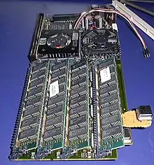 This accelerator board was designed for the Amiga 3000 and Amiga 4000. The accelerator board was famous for its high performance due to its 64 bit wide memory bus and PowerPC 604e processor.[25] According to Phase 5 it could sustain memory transfers up to 68 MB/s on the 68060 and up to 160 MB/s on the 604e.