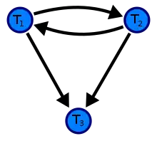 A precedence graph of the schedule D, with 3 transactions. As there is a cycle (of length 2; with two edges) through the committed transactions T1 and T2, this schedule (history) is not Conflict serializable. Notice, that the commit of Transaction 2 does not have any meaning regarding the creation of a precedence graph.