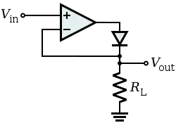 The basic circuit implementing such a feature is shown on the right, where can be any load. When the input voltage is negative, there is a negative voltage on the diode, so it works like an open circuit, no current flows through the load, and the output voltage is zero. When the input is positive, it is amplified by the operational amplifier, which switches the diode on. Current flows through the load and, because of the feedback, the output voltage is equal to the input voltage.