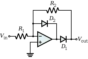 An alternative version is given on the right. In this case, when the input is greater than zero, D1 is off, and D2 is on, so the output is zero because the other end of is connected to the virtual ground and there is no current through . When the input is less than zero, D1 is on and D2 is off, so the output is like the input with an amplification of . Its input–output relationship is the following: