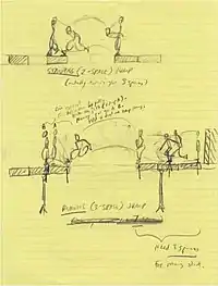 Prince of Persia was programmed in 6502 assembly, a low-level programming language.[10] Mechner used an animation technique called rotoscoping, with which he used footage to animate the characters' sprites and movements. To create the protagonist's platforming motions, Mechner traced video footage of his younger brother running and jumping in white clothes.[11] To create the game's sword fighting sprites, Mechner rotoscoped the final duel scene between Errol Flynn and Basil Rathbone in The Adventures of Robin Hood.[9] Though the use of rotoscoping was regarded as a pioneering move, Mechner later recalled that "when we made that decision with Prince of Persia, I wasn't thinking about being cutting edge — we did it essentially because I'm not that good at drawing or animation, and it was the only way I could think of to get lifelike movement."[12] Also unusual was the method of combat: protagonist and enemies fought with swords, not projectile weapons, as was the case in most contemporary games. Mechner has said that when he started programming, the first ten minutes of the film Raiders of the Lost Ark had been one of the main inspirations for the character's acrobatic responses in a dangerous environment.[13]