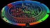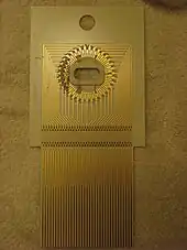 A probe card or DUT board is a printed circuit board (PCB), and is the interface between the integrated circuit and a test head, which in turn attaches to automatic test equipment (ATE) (or "tester").[2] Typically, the probe card is mechanically docked to a Wafer testing prober and electrically connected to the ATE . Its purpose is to provide an electrical path between the test system and the circuits on the wafer, thereby permitting the testing and validation of the circuits at the wafer level, usually before they are diced and packaged. It normally comprises a PCB and some form of contact elements, usually metallic.[lower-alpha 2][3]
