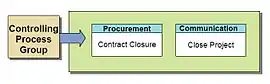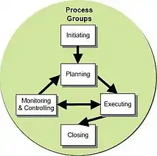 There are five phases to a project lifecycle; known as process groups. Each process group represents a series of inter-related processes to manage the work through a series of distinct steps to be completed. This type of project approach is often referred to as "traditional"[31] or "waterfall".[32] The five process groups are: