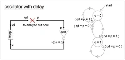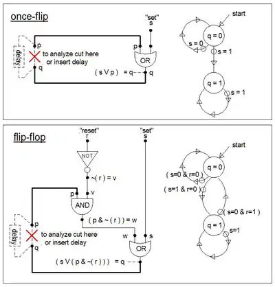 - ↑ McKlusky p. 194-5 discusses "breaking the loop" and inserts "amplifiers" to do this; Wickes (p. 118-121) discuss inserting delays. McCluskey p. 195ff discusses the problem of "races" caused by delays.