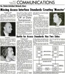 The fourth biennial Data Communications Symposium later that year included presentations from Davies, Louis Pouzin, Derek Barber, and Ira Cotten about the current state of packet-switched networking.[nb 6] The conference was covered by Computerworld magazine which ran a story on the "battle for access standards" between datagrams and virtual circuits, as well as a piece describing the "lack of standard access interfaces for emerging public packet-switched communication networks is creating 'some kind of monster' for users". At the conference, Louis Pouzin said pressure from European PTTs forced the Canadian DATAPAC network to change from a datagram to virtual circuit approach,[36] although historians attribute this to IBM's rejection of their request for modification to their proprietary protocol.[89] Pouzin was outspoken in his advocacy for datagrams and attacks on virtual circuits and monopolies. He spoke about the "political significance of the [datagram versus virtual circuit] controversy," which he saw as "initial ambushes in a power struggle between carriers and the computer industry. Everyone knows in the end, it means IBM vs. Telecommunications, through mercenaries."[61]
