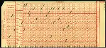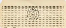 Hollerith envisioned a number of card sizes. In an article he wrote describing his proposed system for tabulating the 1890 U.S. census, Hollerith suggested a card 3 by 5+1⁄2 inches (7.6 by 14.0 cm) of Manila stock "would be sufficient to answer all ordinary purposes."[40] The cards used in the 1890 census had round holes, 12 rows and 24 columns. A reading board for these cards can be seen at the Columbia University Computing History site.[41] At some point, 3+1⁄4 by 7+3⁄8 inches (83 by 187 mm) became the standard card size. These are the dimensions of the then-current paper currency of 1862–1923.[42] This size was needed in order to use available banking-type storage for the 60,000,000 punched cards to come nationwide.[43] Hollerith's original system used an ad hoc coding system for each application, with groups of holes assigned specific meanings, e.g. sex or marital status. His tabulating machine had up to 40 counters, each with a dial divided into 100 divisions, with two indicator hands; one which stepped one unit with each counting pulse, the other which advanced one unit every time the other dial made a complete revolution. This arrangement allowed a count up to 9,999. During a given tabulating run counters were assigned specific holes or, using relay logic, combination of holes.[40]