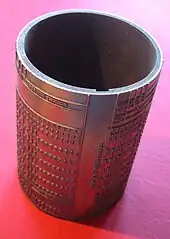 Discarded printing plates from these card presses, each printing plate the size of an IBM card and formed into a cylinder, often found use as desk pen/pencil holders, and even today are collectible IBM artifacts (every card layout[75] had its own printing plate).