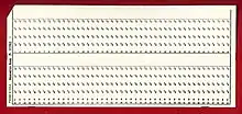 This IBM card format, introduced in 1928,[48] has rectangular holes, 80 columns, and 10 rows.[49] Card size is 7+3⁄8 by 3+1⁄4 inches (187 by 83 mm). The cards are made of smooth stock, 0.007 inches (180 μm) thick. There are about 143 cards to the inch (56/cm). In 1964, IBM changed from square to round corners.[50] They come typically in boxes of 2,000 cards[51] or as continuous form cards. Continuous form cards could be both pre-numbered and pre-punched for document control (checks, for example).[52]