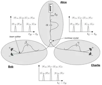 - Alice: A pulsed laser emitted at time enters an interferometer with unequal path lengths such that the pump is split into two distinct temporal pulses with equal amplitude. One arm of the interferometer contains a phase shifter to control the phase difference of the two arms, denoted The pump pulses are focused onto a nonlinear crystal where some of the pump photons are down-converted into photon pairs via SPDC. The SPDC pairs are then split, with one being sent to Bob and the other to Charlie.