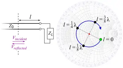 A transmission line that is terminated in some impedance, ZL, that is different from the characteristic impedance, Z0, will result in a wave being reflected from the termination back to the source. At the input to the line the reflected voltage adds to the incident voltage and the reflected current subtracts (because the wave is travelling in the opposite direction) from the incident current. The result is that the input impedance of the line (ratio of voltage to current) differs from the characteristic impedance and for a line of length l is given by;[7]