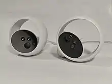 The included controllers with the Quest 2 are the third generation Oculus Touch controllers. The design of the new controllers was influenced by the original Oculus Rift controllers.[13] Their battery life has also been increased four-fold over the controllers included with the first-generation Quest.[21][8][13]