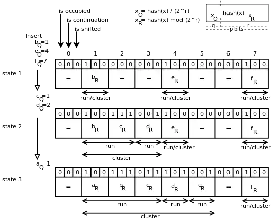 The figure shows a quotient filter proceeding through a series of states as elements are added. In state 1 three elements have been added. The slot each one occupies forms a one-slot run which is also a distinct cluster.