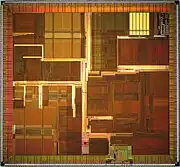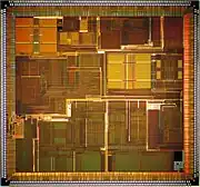 The R12000 was fabricated by NEC and Toshiba in a 0.25 µm CMOS process with four levels of aluminum interconnect. The use of a new process does not mean that the R12000 was a simple die shrink with a tweaked microarchitecture; the layout of the die is optimized to take advantage of the 0.25 µm process.[4][5] The NEC fabricated VR12000 contained 7.15 million transistors and measured 15.7 by 14.6 mm (229.22 mm2).
