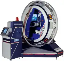 The R360 was designed by Sega AM2.[1] Its name is short for "Rotate 360", representative of the cabinet's ability to spin 360 degrees in any direction.[2] Physically, the unit is 7 feet (210 cm) in diameter and 8 feet (240 cm) tall. It weighs over 2,200 pounds (1,000 kg), and utilizes a 20-inch (51 cm) monitor for gameplay. The cabinet is mounted on a gyroscope that can rotate along two axes, attached to a base which is stationery.[3]
