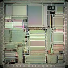 The streaming cache's tags are contained on two Tag RAM chips, one for each bank. Both chips contain identical data. Each chip contains 1.189 Mbit of cache tags implemented by four-transistor SRAM cells. The chips are implemented in a 0.7 μm BiCMOS process with two levels of polysilicon and two levels of aluminium interconnect. BiCMOS circuitry was used in the decoders and combined sense amplifier and comparator portions of the chip to reduce cycle time. Each Tag RAM is 14.8 mm by 14.8 mm large, packaged in a 155-pin CPGA, and dissipates 3 W at 75 MHz.[6] In addition to providing the cache tags, the Tag RAMs are responsible for the streaming cache being four-way set associative. To avoid high a pin count, the cache tags are four-way set associative and logic selects which set to access after lookup instead of the usual way of implementing set-associative caches.[1]