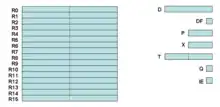 The 1802 is an 8-bit byte machine, with minimal support for 16-bit operations, except via 2-byte manipulation. The primary accumulator is the 8-bit 'D' register (Data register). The single bit carry flag is DF (Data Flag). Most operations use the D register, including arithmetic and logic functions, and memory referencing load and store instructions. Most 16-bit operations have to work on the lower byte and then the upper byte, via D, using the DF as carry and borrow as needed.