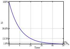 These equations show that a series RC circuit has a time constant, usually denoted τ = RC being the time it takes the voltage across the component to either rise (across the capacitor) or fall (across the resistor) to within 1/e of its final value. That is, τ is the time it takes VC to reach V(1 − 1/e) and VR to reach V(1/e).