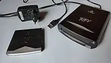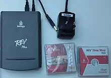 A seemingly-similar competing technology is RDX Technology. A key distinction, however, is that the REV drive heads and drive controller remain inside the drive when the hard-disk platter is removed from it. In RDX Technology, the drive heads are contained within the cartridge along with the platter and are removed along with it.