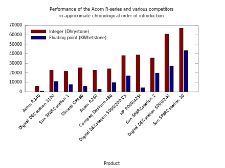 In computational performance terms, Acorn's R140 compared unfavourably with other 1989 models such as the Sun SPARCstation 1[56] and Digital DECstation 3100,[57] particularly with regard to floating-point performance, although such disadvantages could perhaps have been somewhat overlooked in an entry-level workstation costing around £4,000 or approximately $6,545, compared to $12,620 for the DECstation 3100, or $7,995 for the entry-level DECstation 2100.[57] The R260 compared more favourably in terms of integer performance with its contemporaries employing processors such as the Intel 486 and Motorola 68030, but comparing less favourably with 68040-based models and newer models from traditional RISC workstation vendors.[58] In terms of pricing, although the R260 maintained a similar price point to the R140, increasing pricing competition between Digital and Sun brought models like the DECstation 2100 down to $5,950 even before the R260's introduction at an already reduced price of £3,995, equivalent to $7,094.[59] At the point of the introduction of floating-point hardware for the R260 in 1993, the performance of the R260 was decidedly uncompetitive with the final MIPS-based DECstation models and contemporary SPARCstation models.[60]