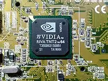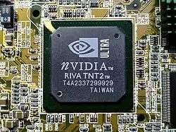 The RIVA TNT2 is a graphics processing unit manufactured by Nvidia starting in early 1999. The chip is codenamed "NV5" because it is the 5th graphics chip design by Nvidia, succeeding the RIVA TNT (NV4). RIVA is an acronym for Real-time Interactive Video and Animation accelerator.[1] The "TNT" suffix refers to the chip's ability to work on two texels at once (TwiN Texel).[2] Nvidia removed RIVA from the name later in the chip's lifetime.[2]