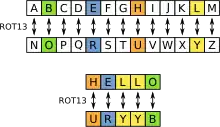 In December 1999, it was found that Netscape Communicator used ROT13 as part of an insecure scheme to store email passwords.[10] In 2001, Russian programmer Dimitry Sklyarov demonstrated that an eBook vendor, New Paradigm Research Group (NPRG), used ROT13 to encrypt their documents; it has been speculated that NPRG may have mistaken the ROT13 toy example—provided with the Adobe eBook software development kit—for a serious encryption scheme.[11] Windows XP uses ROT13 on some of its registry keys.[12] ROT13 is also used in the Unix fortune program to conceal potentially offensive dicta.