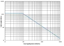 The maximum cable length is not specified in the standard, but guidance is given in its annex. (This annex is not a formal part of the standard, but is included for information purposes only.) Limitations on line length and data rate varies with the parameters of the cable length, balance, and termination, as well as the individual installation. Figure A.1 shows a maximum length of 1,200 meters (3,900 ft), but this is with a termination, and the annex discusses the fact that many applications can tolerate greater timing and amplitude distortion, and that experience has shown that the cable length may be extended to several kilometers. Conservative maximum data rates with 24AWG UTP (POTS) cable are 10 Mbit/s at 12 m (39 ft) to 90 kbit/s at 1,200 m (3,900 ft), as shown in the figure A.1. This figure is a conservative guide based on empirical data, not a limit imposed by the standard.