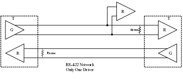 RS-422 cannot implement a true multi-point communications network, such as with EIA-485, since there can be only one driver on each pair of wires. However, one driver can fan-out to up to ten receivers.