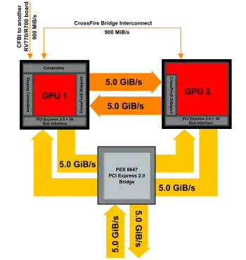 This generation of dual-GPU design retains the use of a PCI Express bridge, PLX PEX 8647 with a power dissipation of 3.8 watts inclusive of PCI Express 2.0 support, allowing two GPUs on the same PCI Express slot with doubled bandwidth over the past generation of product (Radeon HD 3870 X2). Subsequent generations of dual-GPU design also feature an interconnect for inter-GPU communications through the implementation of a CrossFire X SidePort on each GPU, giving extra 5 GB/s full-duplex inter-GPU bandwidth. These two features increase total bandwidth for dual-GPU designs to 21.8 GB/s.