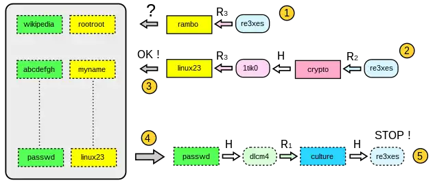 - If this test is positive (step 3, linux23 appears at the end of the chain and in the table), the password is retrieved at the beginning of the chain that produces linux23. Here we find passwd at the beginning of the corresponding chain stored in the table.