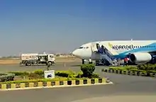 Rajkot Airport[43] is located at a short distance from the city and can be accessed by cab and auto rickshaw services. There are two daily flights to Mumbai, served by Air India. SpiceJet started its services from Mumbai to Rajkot on 27 October 2019. Air India started the Rajkot-Delhi flight from 15 February 2015.[44] One more daily flight from and to New Delhi has been started by Air India from 1 August 2019. It is connected with Goa as well, done by IndiGo in May 2023, along with upcoming destinations to Indore and Udaipur starting from August 2023.[45] The Government of India planned to build a second airport as an international airport to meet the growing traffic and demands due to rapid urbanization and to boost tourism in the city as well as in the Saurashtra region, because the existing airport could not expand due to urban expansion around it. Rajkot has now two airports, with the new airport being Rajkot International Airport at Hirasar, located 36 km (22 mi) away from the existing airport, which opened in July 2023.[46]