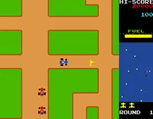 Rally-X (Japanese: ラリーX, Hepburn: Rarī-Ekkusu) is a maze chase arcade video game developed in Japan and Germany by Namco and released in 1980. In North America, it was distributed by Midway Manufacturing and in Europe by Karateco. Players drive a blue Formula One race car through a multidirectional scrolling maze to collect yellow flags. Boulders block some paths and must be avoided. Red enemy cars pursue the player in an attempt to collide with them. Red cars can be temporarily stunned by laying down smoke screens at the cost of fuel. Rally-X is one of the first games with bonus stages and continuously-playing background music.