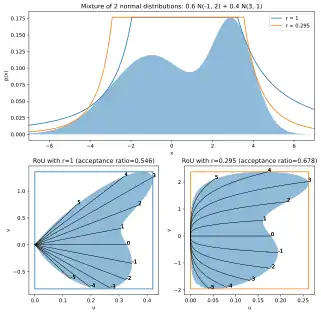 Consider the mixture of two normal distributions . To apply the method of the ratio of uniforms, with a given , one should first determine the boundaries of the rectangular bounding box enclosing the set . This can be done numerically, by computing the minimum and maximum of and on a grid of values of . Then, one can draw uniform samples , only keep those that fall inside the set and return them as .